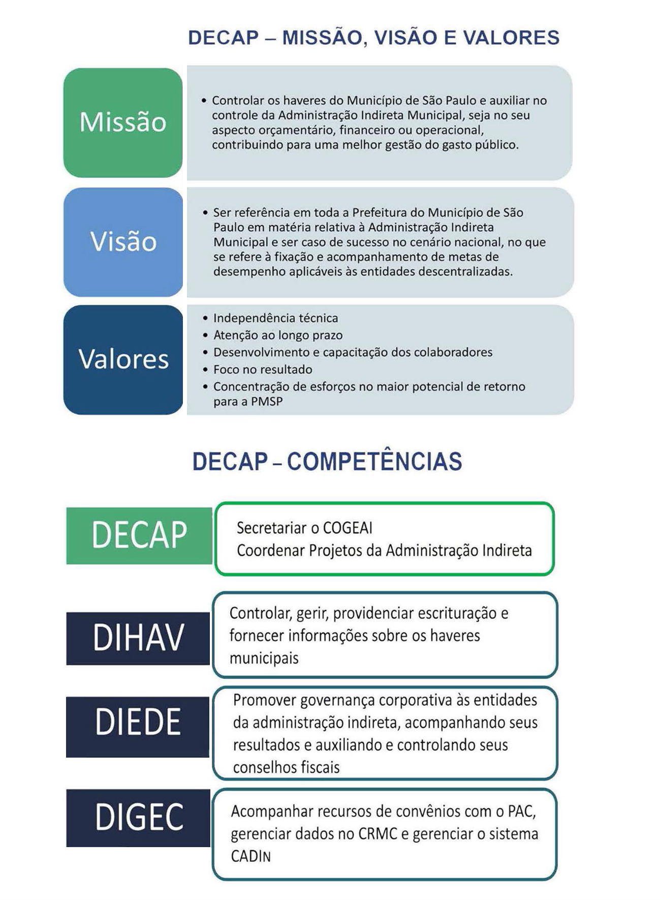 O Departamento de Defesa de Capitais e Haveres do Município (DECAP), unidade da Subsecretaria do Tesouro Municipal (SUTEM), é responsável pelo acompanhamento, gerenciamento e controle dos haveres do Município de São Paulo e pelo auxílio no controle orçamentário, financeiro e operacional da Administração Indireta Municipal.