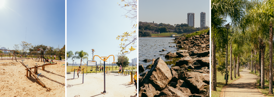 Sede, pista de caminhada, campo de futebol, playground infantil, playground da longevidade, ciclovia, praça e píer; acessibilidade nos sanitários. É muito utilizado para caminhadas, pois a área plana do parque favorece essa prática.