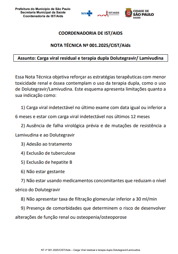 | Linha de cuidados da Transmissão Vertical do HIV | Nota Técnica - Carga Viral Residual e Terapia Dupla Dolutegravir/Lamivudina |